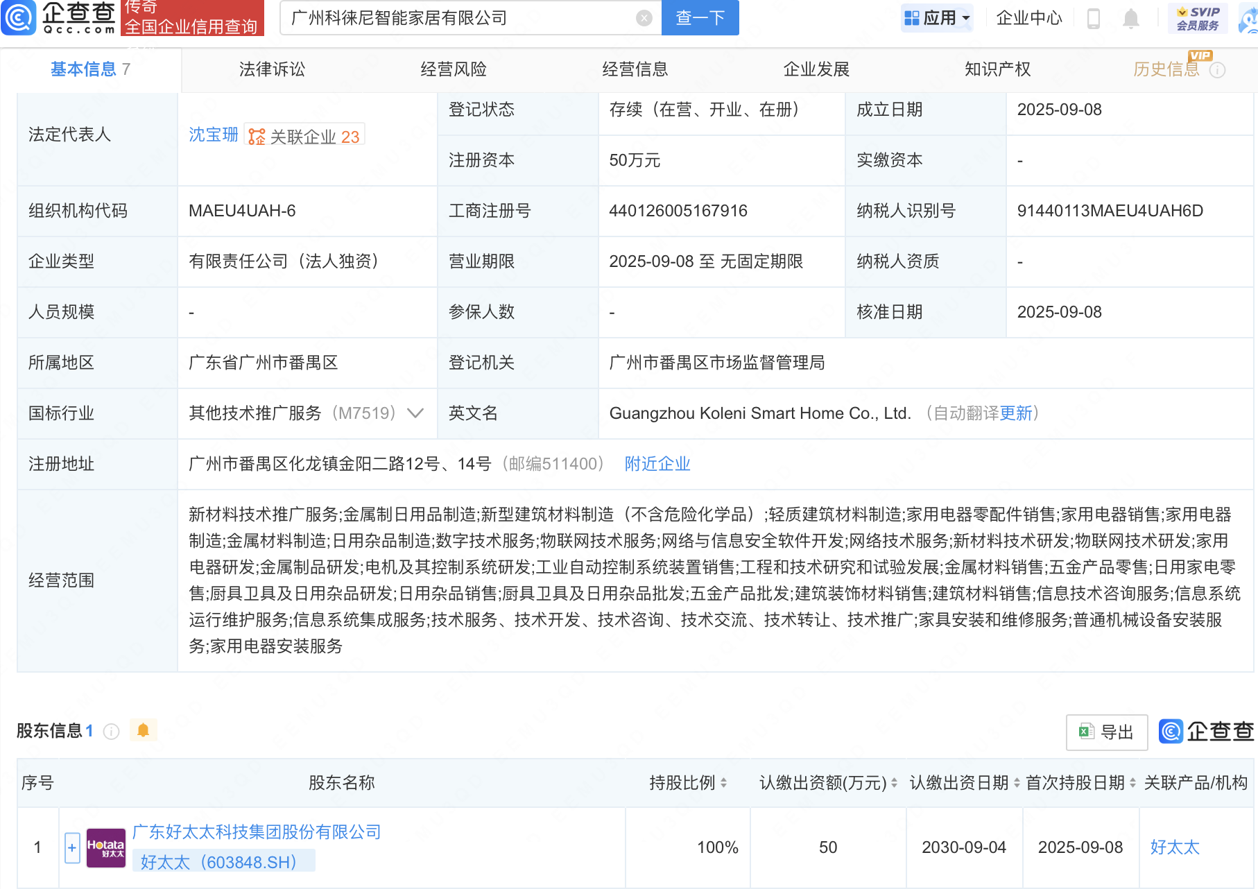 近日,广州科徕尼智能家居有限公司成立,法定代表人为沈宝珊,经营范围包含:数字技术服务;物联网技术服务;新材料技术研发;物联网技术研发等。企查查股权穿透显示,该公司由好太太(603848)全资持股。